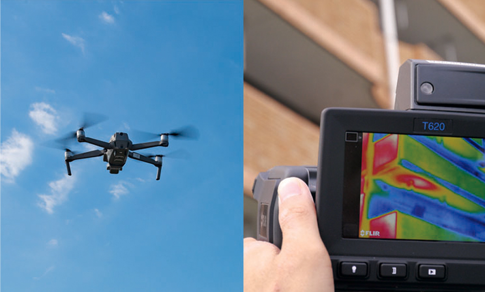 ドローン撮影は梯子を掛けず機体を飛ばすことで、上空から屋根等を視認することができる魅力的な方法ですが、有料プランの中にはドローンと赤外線カメラの機能を合体させた調査方法も存在します。建物内部の補修箇所を上空から発見することの出来る非常に便利なプランとなっています。