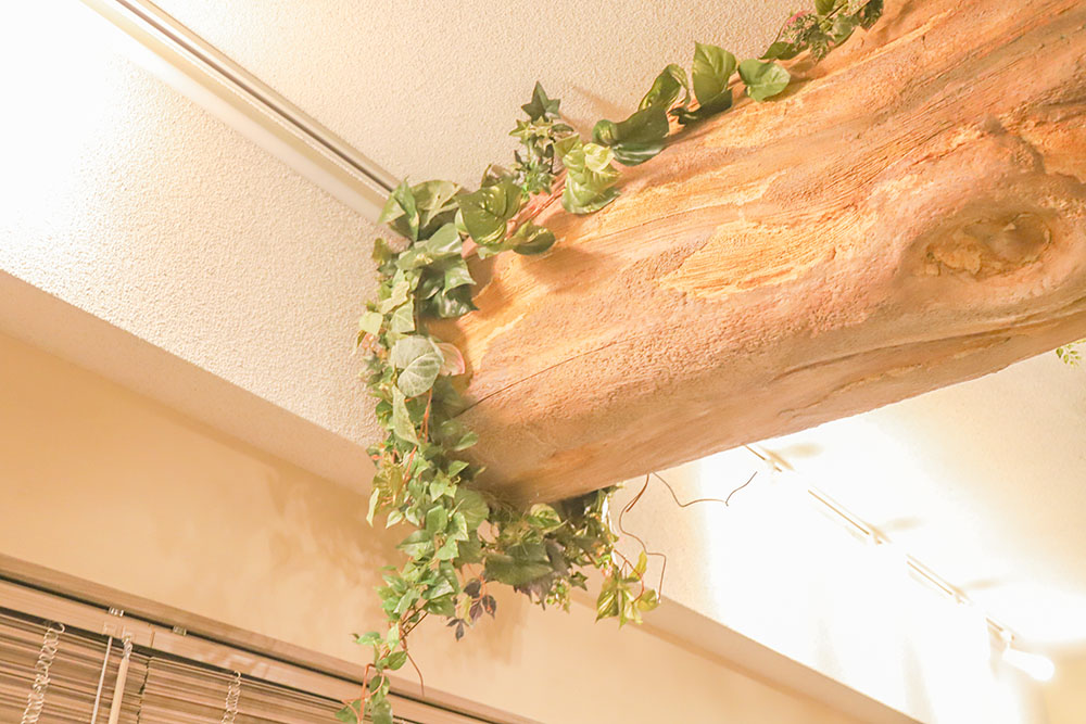 大きな木の幹が2本並び、そこから数本の枝が分かれています。鮮やかな緑色の植物が周囲を飾り、どことなく森の中を想起させる空間です。