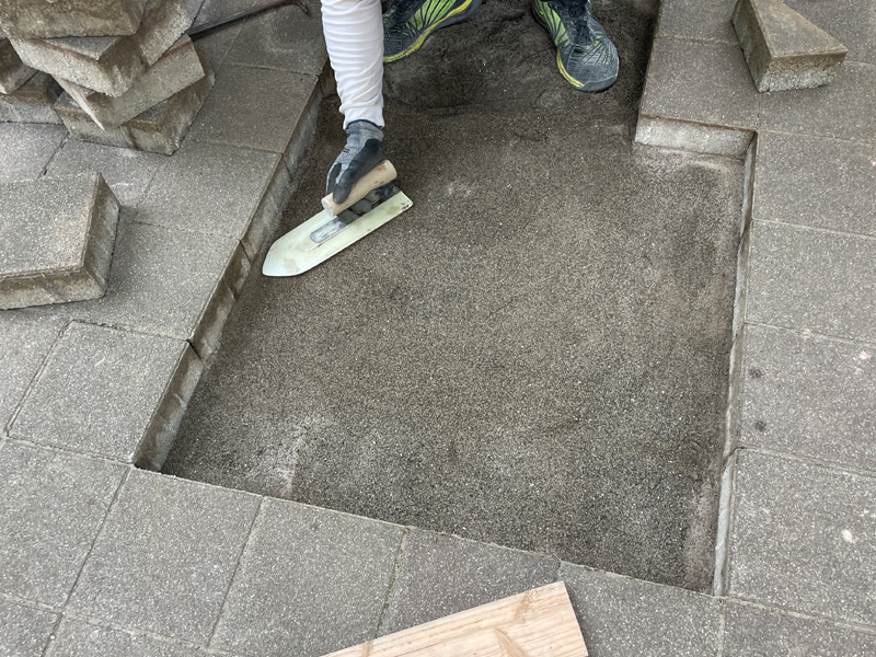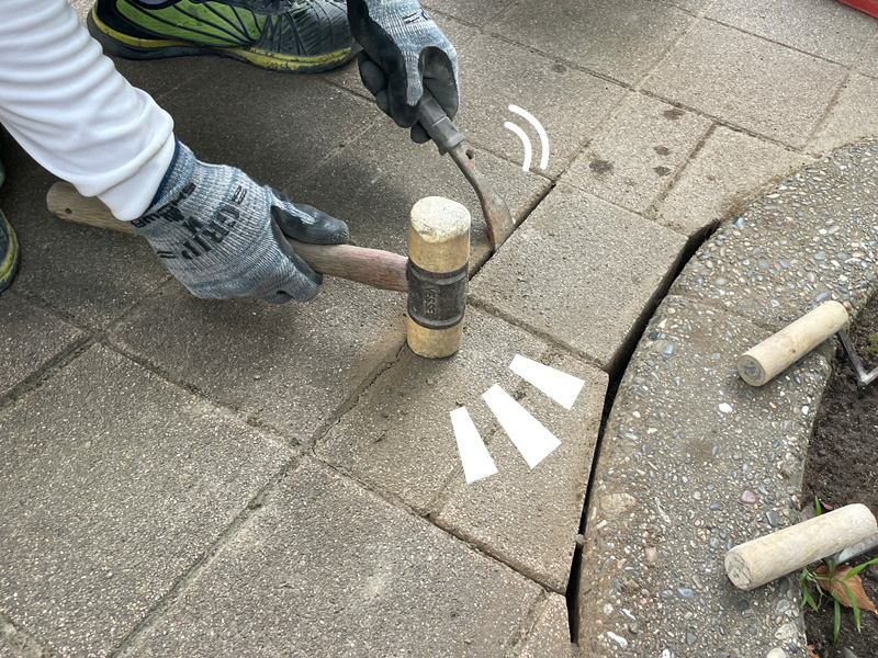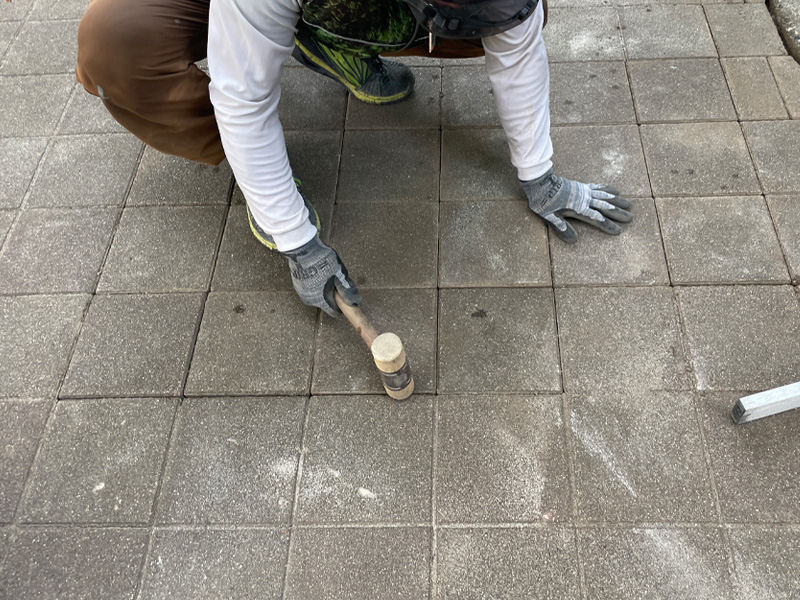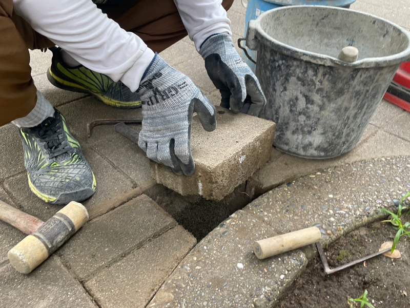 その後、撤去前と同じ順番でブロックを戻し、ハンマーで叩き込みながらしっかり埋め込んでいきました。