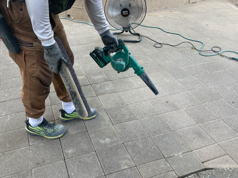 撤去や再配置の際に散らばった土や粉塵を、ホウキやブロワーで丁寧に清掃しました。