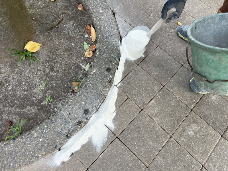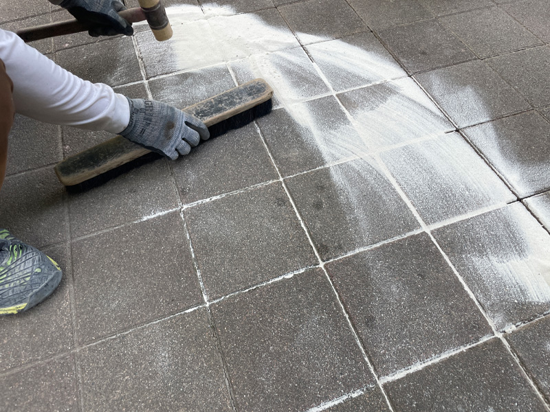 仕上げに「硅砂」をインターロッキングの隙間に入れ込みます。硅砂は粒子が細かいため、ブロックのズレや浮きを防ぎ、長期的な安定性を高める効果があります。
