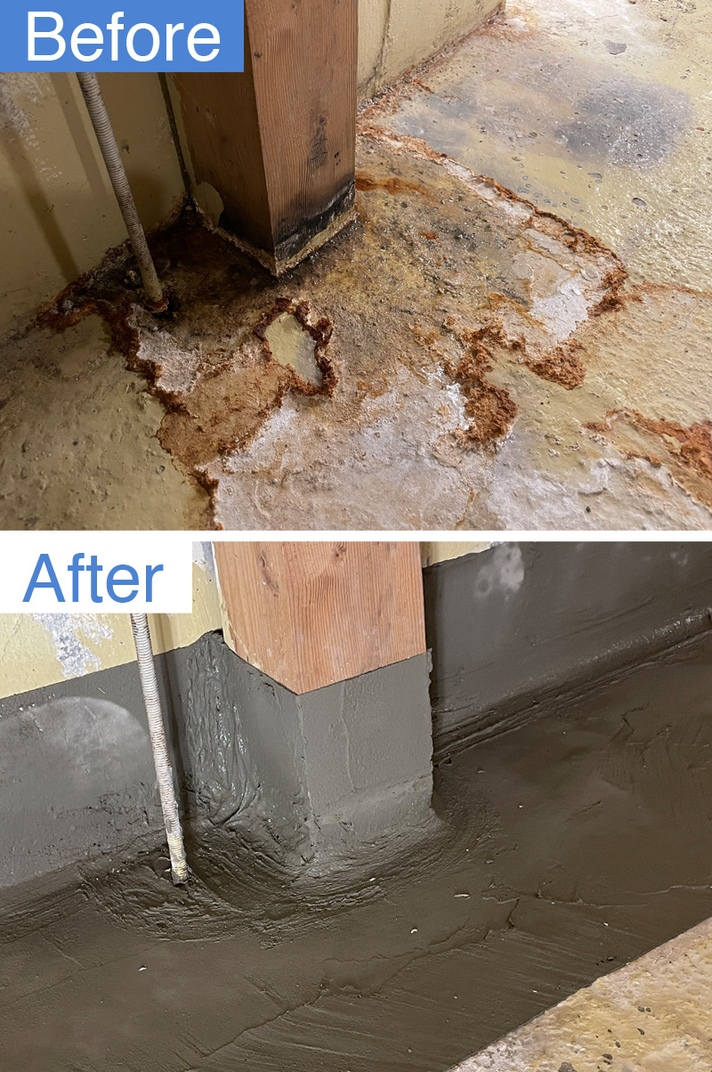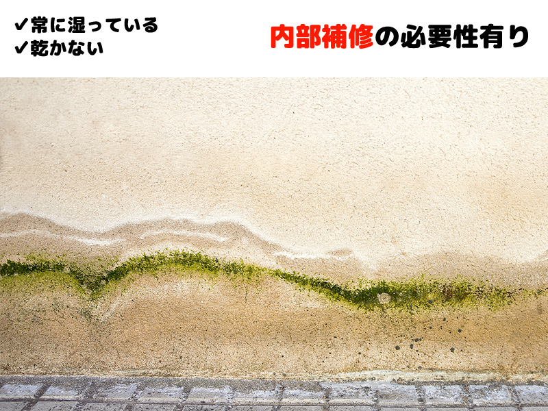 対して、天候に関わらず長期間継続している場合はコンクリート内部に水の通り道が形成されている可能性が高く、内部補修が必要です。