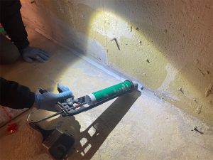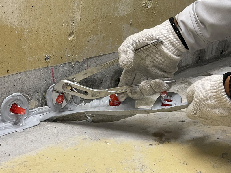打ち継ぎ部からの出水を抑えるため、速硬型の止水材を使用し、仮止水を行います。