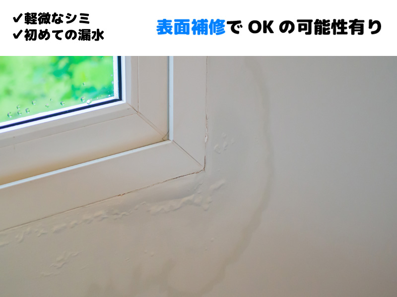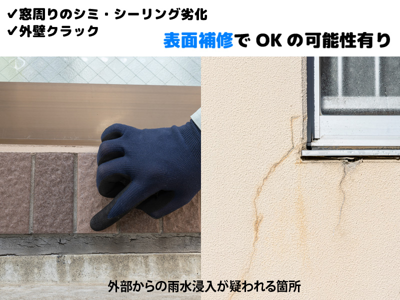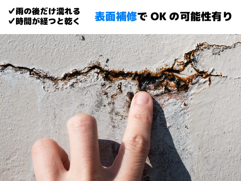 雨天時のみ発生する場合は外部からの浸入が疑われ、表面補修で対応できる場合があります。