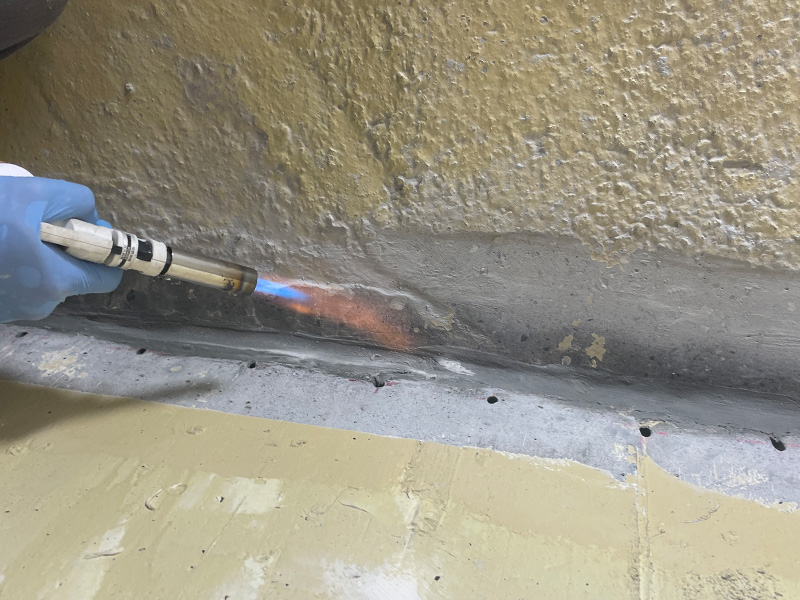 余分な止水材を除去し、ガスバーナーで乾燥させた後、シーリング材を充填して台座の定着性を高めます。