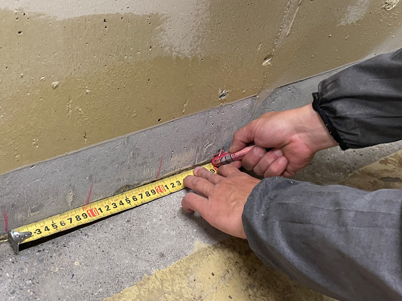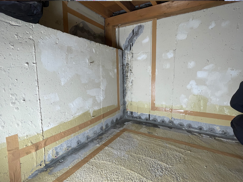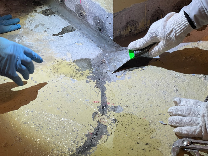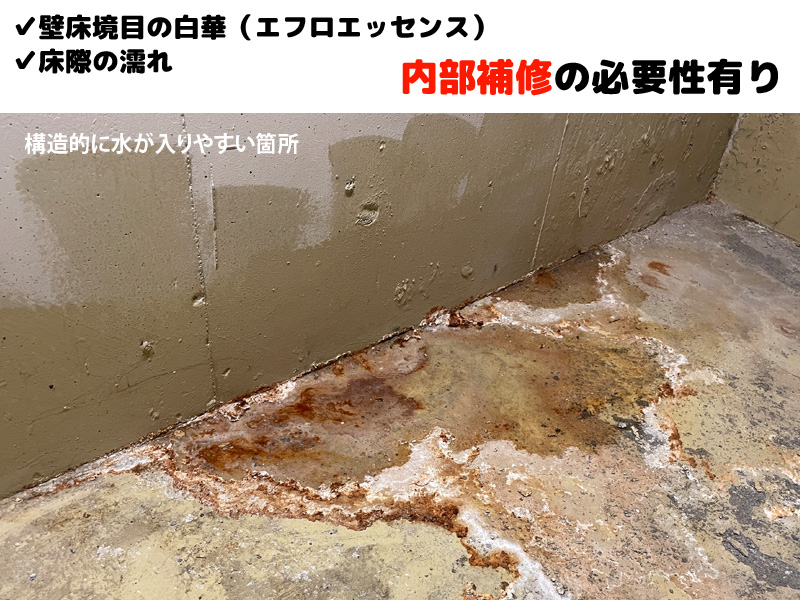 床面や壁面にはひび割れや水染みが確認され、特に壁と床の取り合いである打ち継ぎ部からの滲み出しが多く見られました。