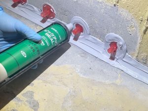 専用の機材を使用し、ひび割れや内部の空隙に樹脂を充填していきます。