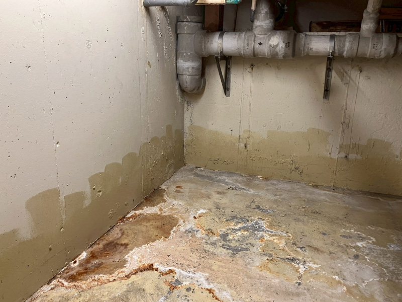 これらの状況から、地下水がコンクリート内部を通って移動し、室内側へと染み出している「湧水」が発生している可能性が高いです。