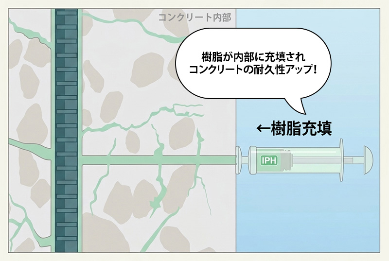 また、充填された樹脂はコンクリート内部で一体化し、水の浸入を抑制するだけでなく、鉄筋腐食や中性化の進行抑制といった耐久性向上にもつながります。