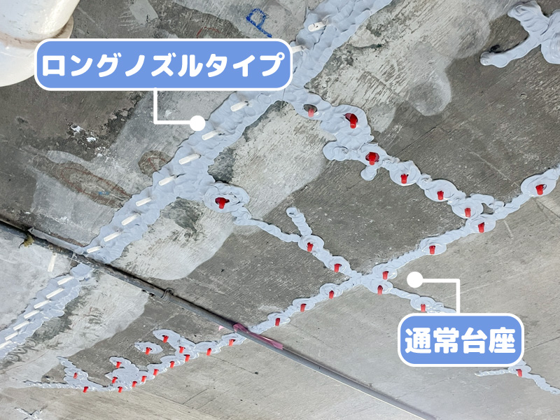 今回の施工では通常台座(赤)に加え、ロングノズルタイプも併用。