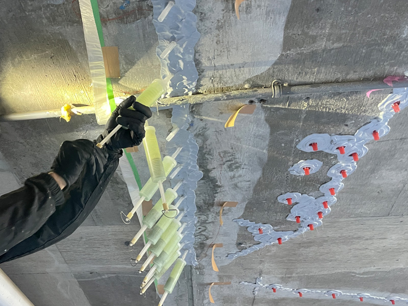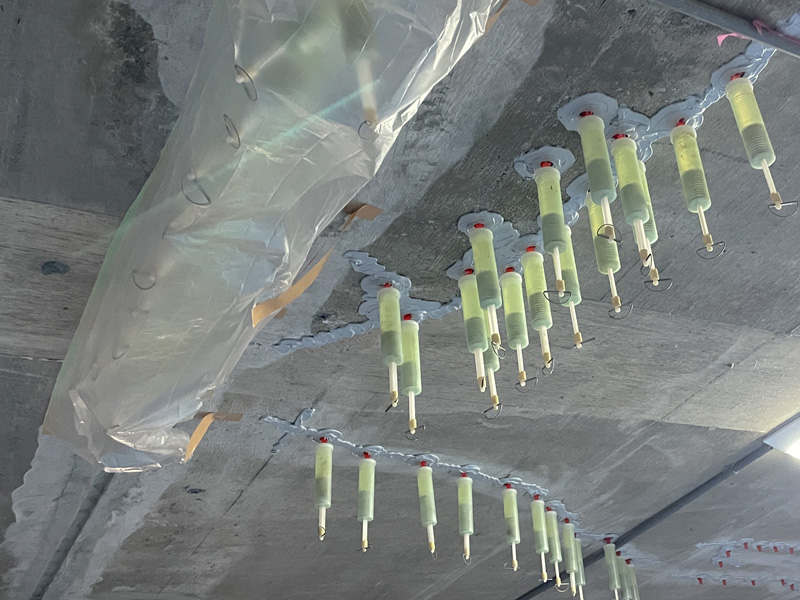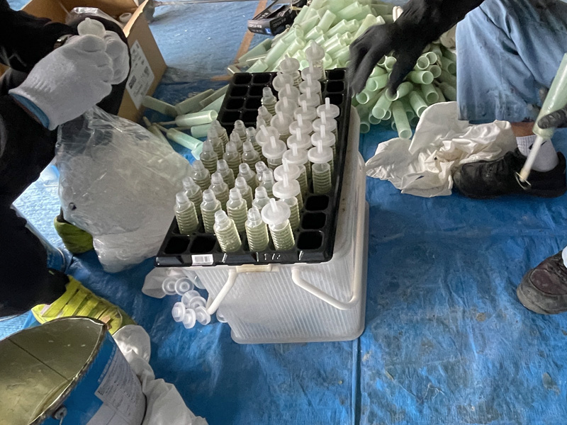 各台座にIPHカプセル(樹脂カプセル)を装着し、ひび割れに樹脂を充填していきます。