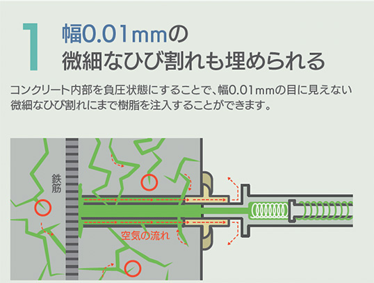 また、独自の注入システムを使い、コンクリート内部を負圧状態にして樹脂を注入できるので、0.01mmレベルの微細な隙間も補修可能です。