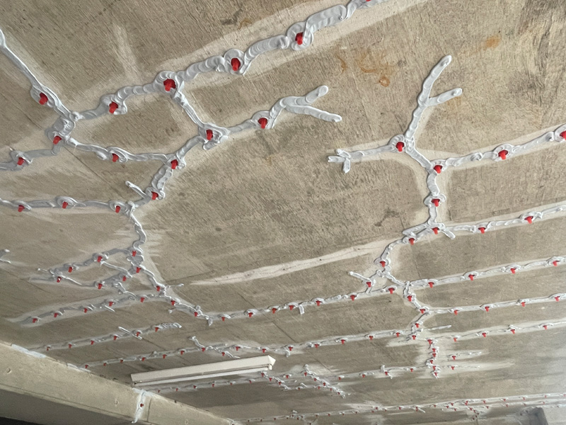 今回は天井への施工のため、樹脂が床にこぼれないようビニールシートをかぶせ、約24時間かけて硬化させます。