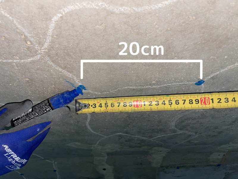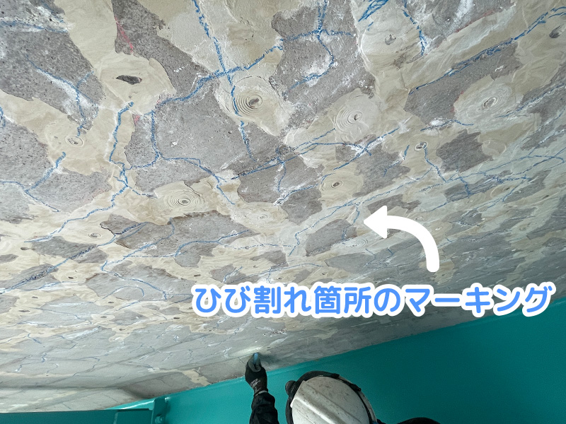 ひび割れ調査のマーキング完了後、穿孔(せんこう)位置のマーキングへ移行します。
