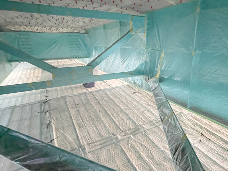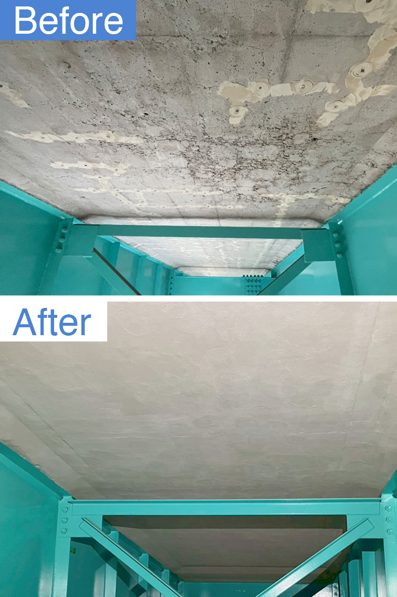 台座設置面やひび割れ部分から樹脂が漏れ出す可能性があるため、壁・梁・床面に養生を施し、周囲を汚さないよう配慮しました。