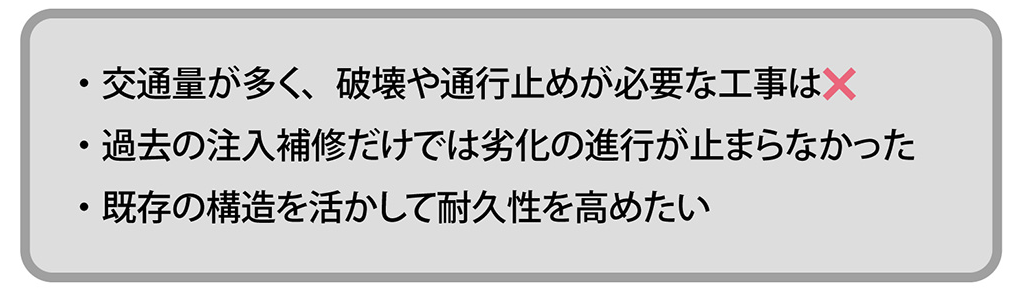 この橋梁は交通量が多く、橋を破壊して架け直すような大規模な工事は現実的ではありません。