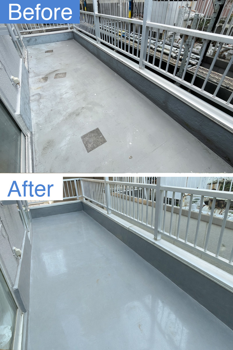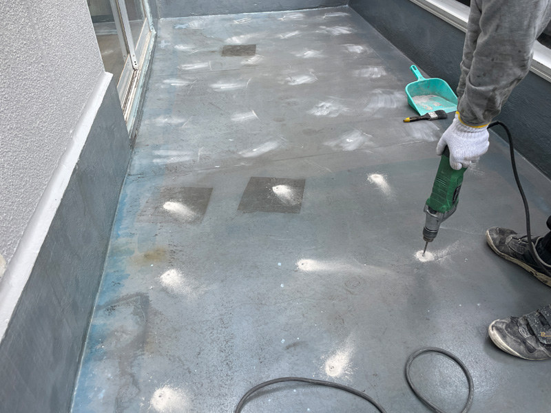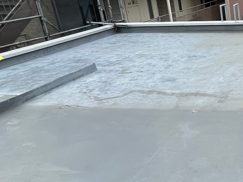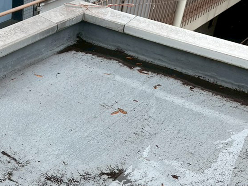 一見すると大きな破損は見られませんが、屋上やバルコニー全体を見ると経年劣化による傷みが進行している状態でした。