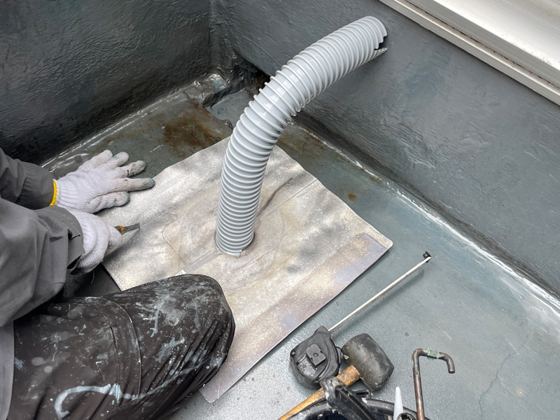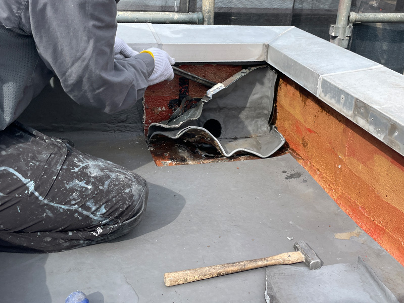 新しいドレンを設置するために鉛板を切り取り、サイズを調整。ハンマーで叩きながら下地に密着させ、防水下地処理用のシール材でしっかり固定します。