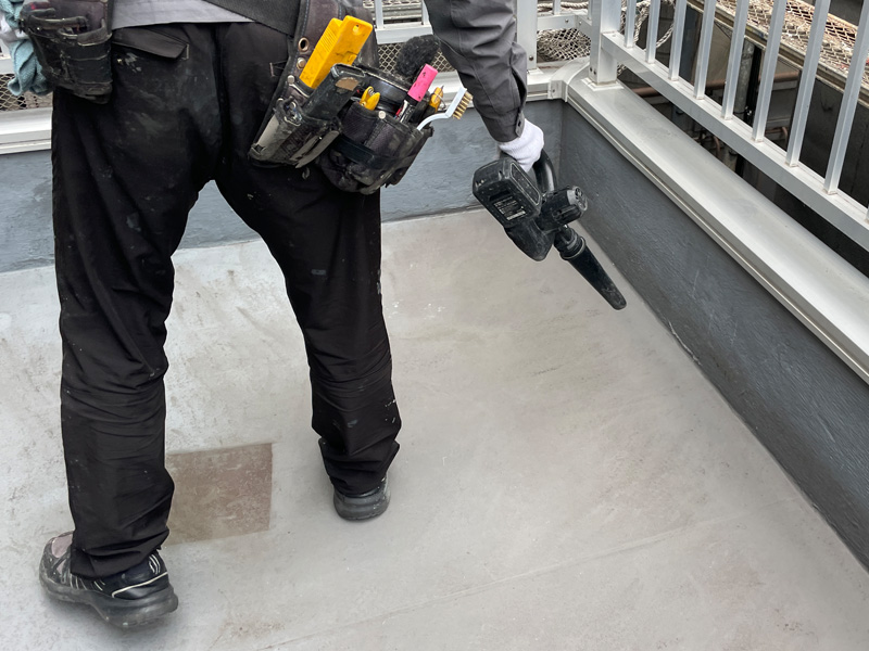 バルコニーではブロワーを使ってゴミや砂を除去し、立ち上がり部分に残っていたバリを削り取ります。