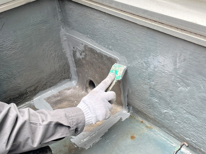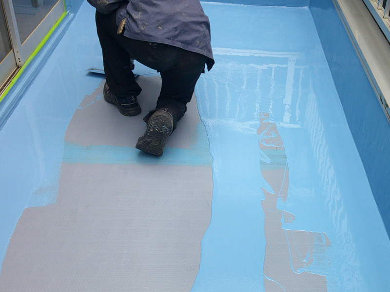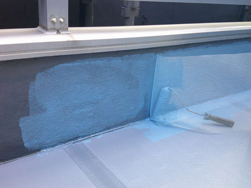 ウレタン防水では、下地の動きやひび割れによる防水層の割れを防ぐため、メッシュシートを貼り付けて補強を行います。