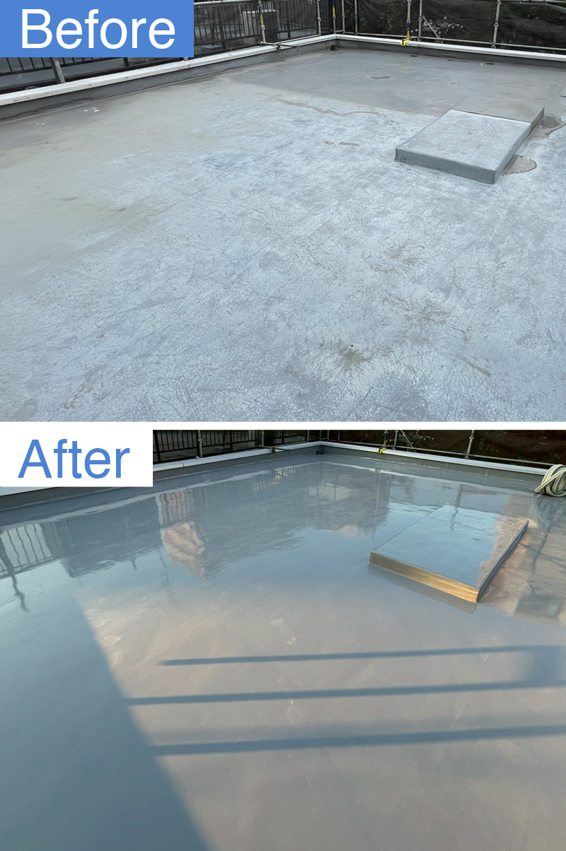 防水材表面のツヤがなくなり、白っぽさや色ムラが出ている場合は、トップコートが劣化しているサインです。