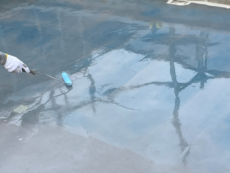これから新しく施工する防水層の定着を高めるため、ローラーを使ってムラが出ないよう均一に施工します。