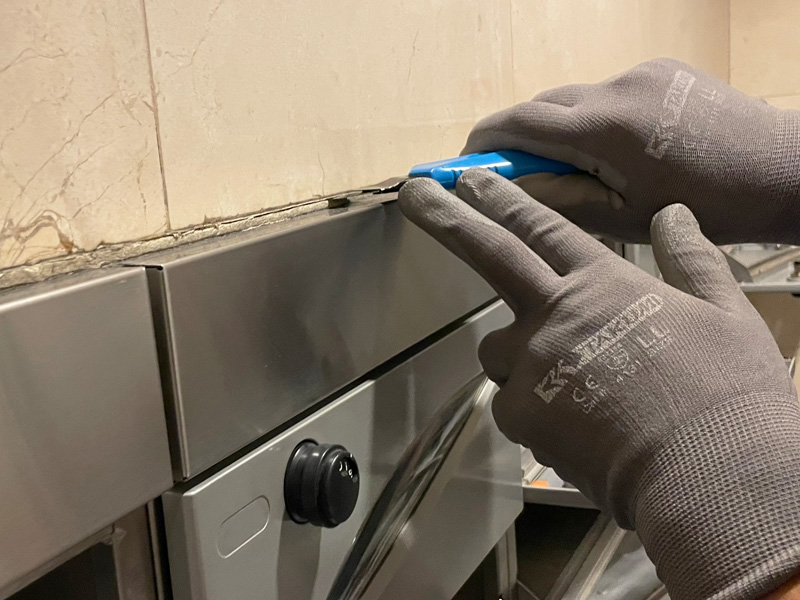 古くなったシーリングを、壁を傷つけないよう、カッターを使って慎重に剥がしていきます。