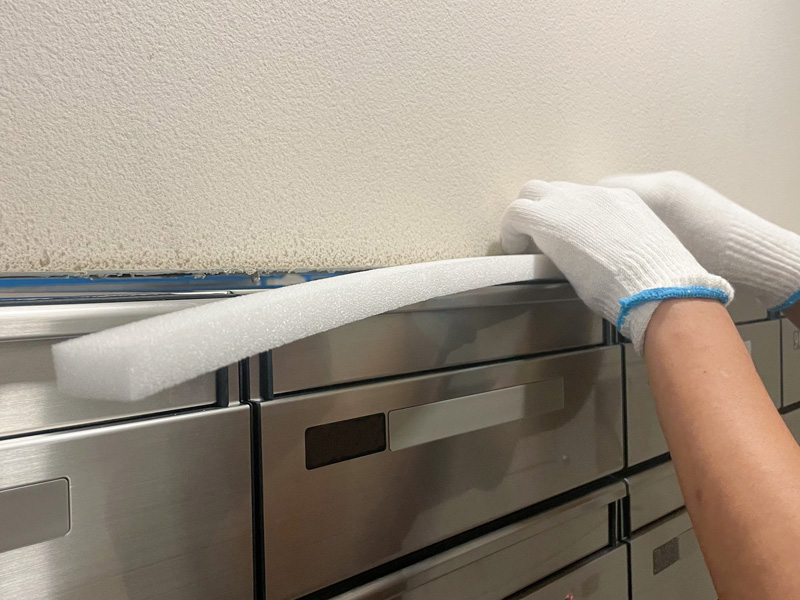 バッカー(スポンジ材)やスペーサーを使って、隙間を調整しながら、きれいな見た目と長持ちする仕上がりを目指します。