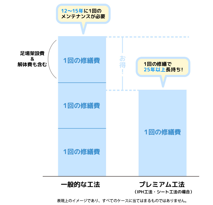 一方、IPH工法やシート工法などの“プレミアム工法”は、一般工法に比べて1回あたりの費用は高くなります