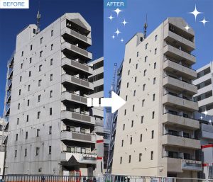 シートを外壁全面に貼ることで、水の入口が塞がり漏水が起こりにくくなったり、コンクリートの剥離につながる劣化の要因をカットできるため、建物の長寿命化にも貢献しています。